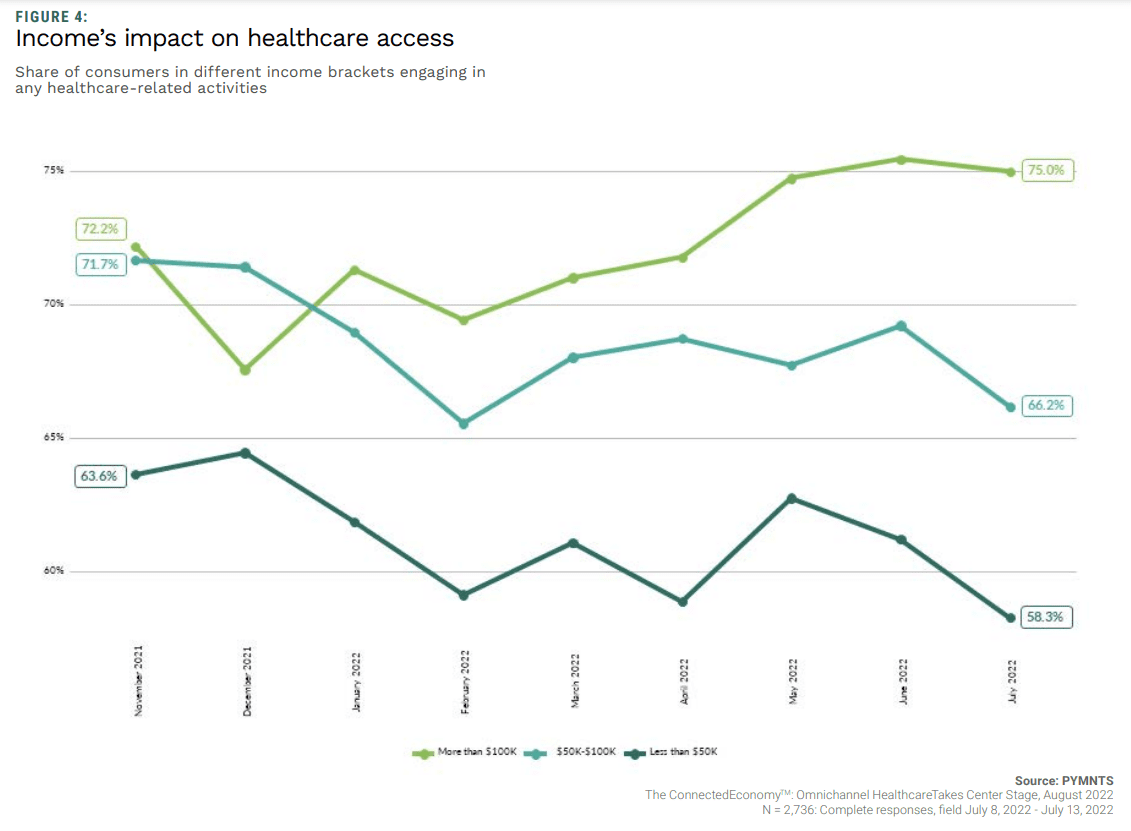 We see it within the information, with the examine stating that “Consumers who earn less than $50,000 in annual income engaged 8% less in any type of healthcare channel last month than they did in November 2021. Just 40% of patients who earn less than $50,000 in annual income engage in digital healthcare activities, and their numbers are falling.”
