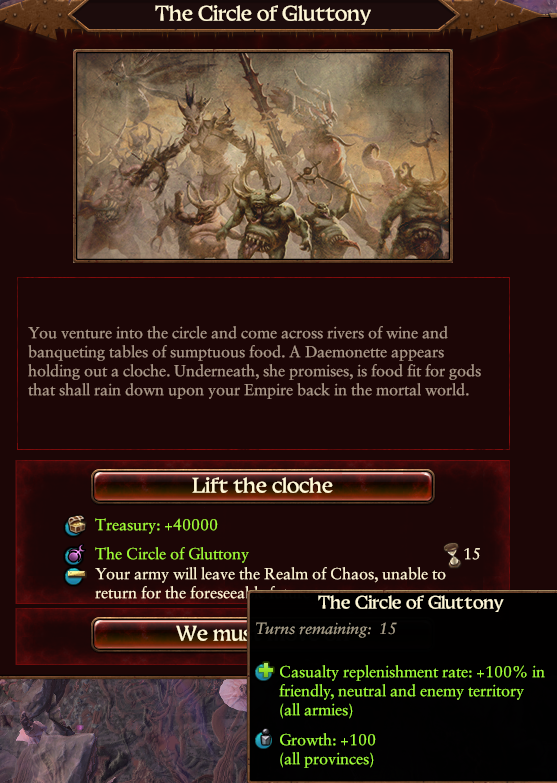 - There are a number of variations of turn-based buffs for some circles, although the buffs could have the very same names. For instance, The Circle of Gluttony buff have two variations; one with 200% replenishment fee and one with 100% replenishment fee.